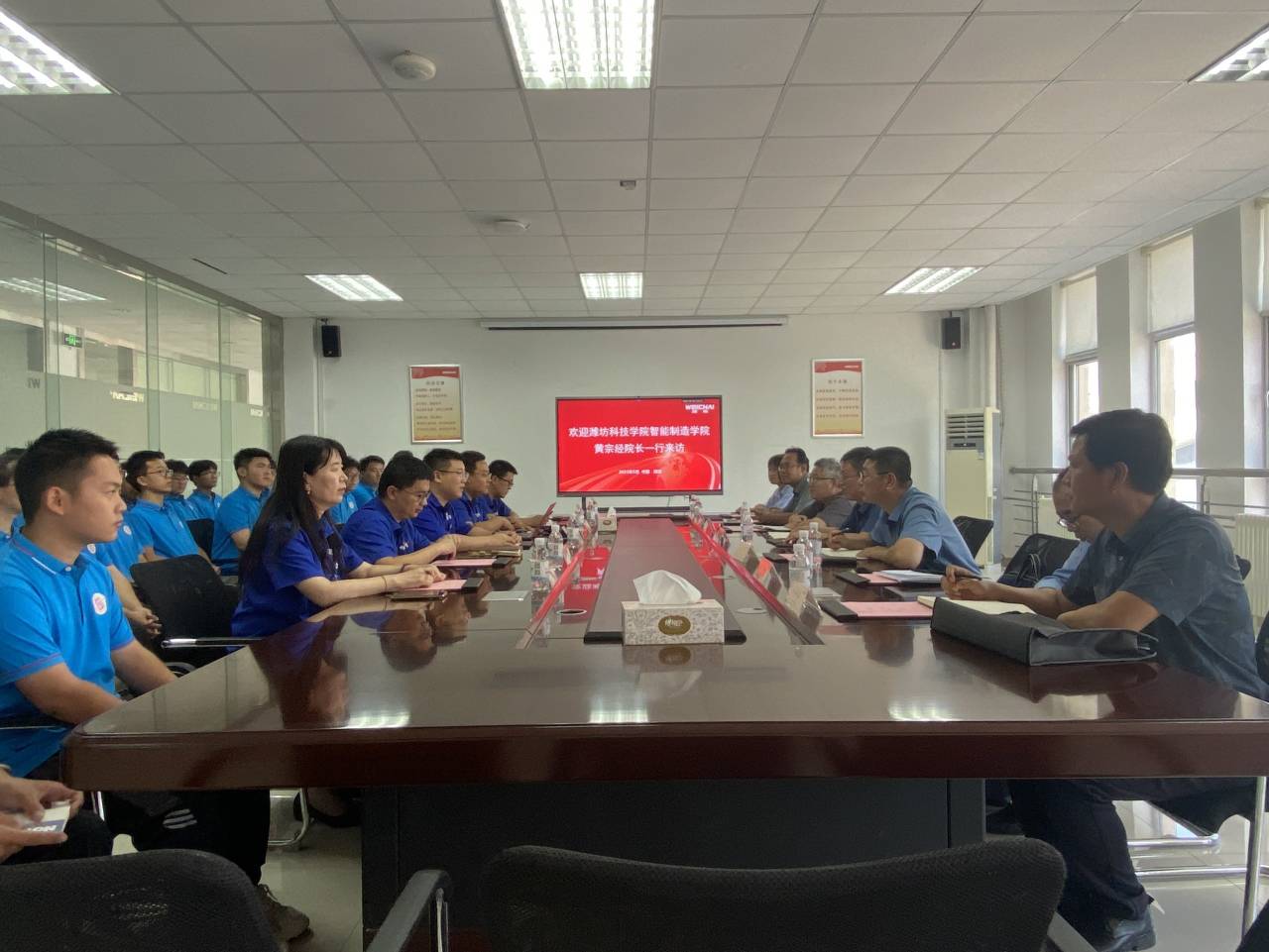 上午,调研组一行先到潍柴集团潍柴大学跟联合培养的学生座谈,了解学生的工作、学习和需求情况,为下一步更好培养学生对接企业需求做调研。潍柴对我校学生在工作岗位的表现非常满意,对我校的人才培养给予肯定。调研组跟潍柴大学戚德鹏主任及负责人就联合申报省级现代产业学院和市级现代产业学院进行了座谈、并参观了潍柴展厅、工厂车间、实训基地等地。